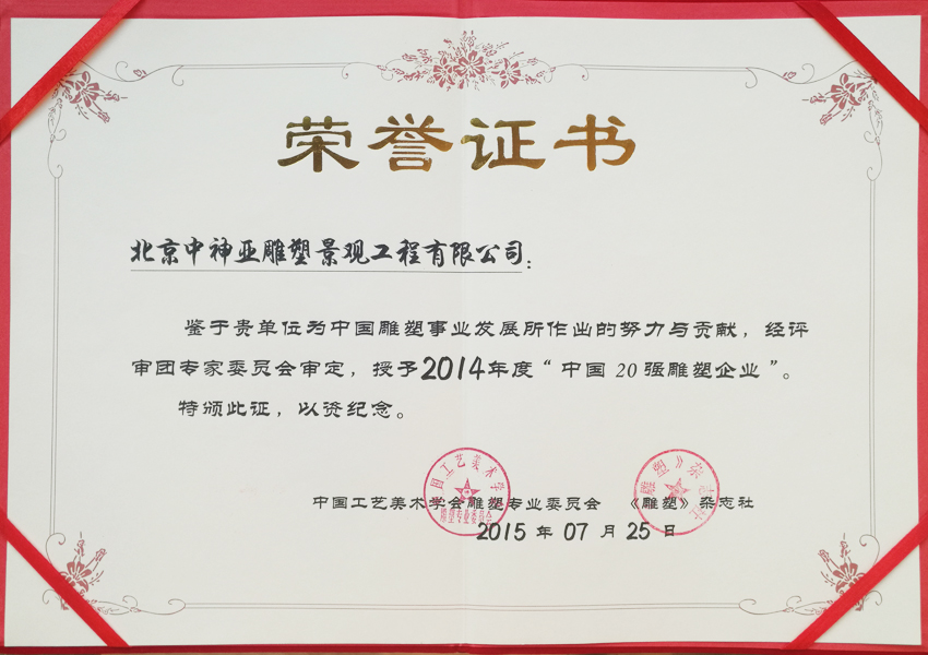 中神亞雕塑企業始建于1986年,(期前身為溫嶺藝術雕刻廠北京分廠)是設計和制作不銹鋼,鈦金屬,鍛銅,鑄銅,石刻等室內外雕塑的專業企業。是中央美術學院雕塑系和清華大學美術學院雕塑系實習創作基地,亦是中國美術家協會雕塑藝術委員會和中國工藝美術學會雕塑專業委員會特別推薦企業;是全國雕塑企業委員會副主任委員單位;是中國雕塑學會理事會員單位;2010年增選為中國建設文化藝術協會環境藝術專業委員會常務理事單位;2011年批準加入為中國建筑金屬結構協會會員,2012年增選為中國建筑金屬結構協會第十屆理事會理事單位;中國鋼結構協會團體會員;是具備住建部核準可承擔各種類型藝術鋼結構、藝術網架結構工程三級資質企業...