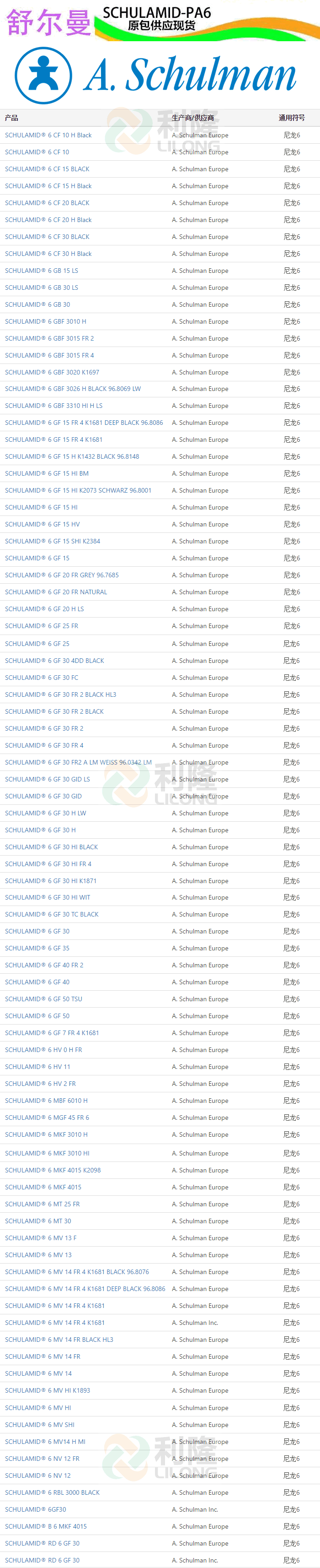 [塑料簡介:]利隆塑料專業經營美國舒爾曼PA6,聚酰胺SCHULAMID品牌PA6塑膠原料,想要了解尼龍PA6塑膠原料,舒爾曼PA6原料價格,PA6性能用途,PA6型號和PA6物性的客戶,歡迎來電來函咨詢