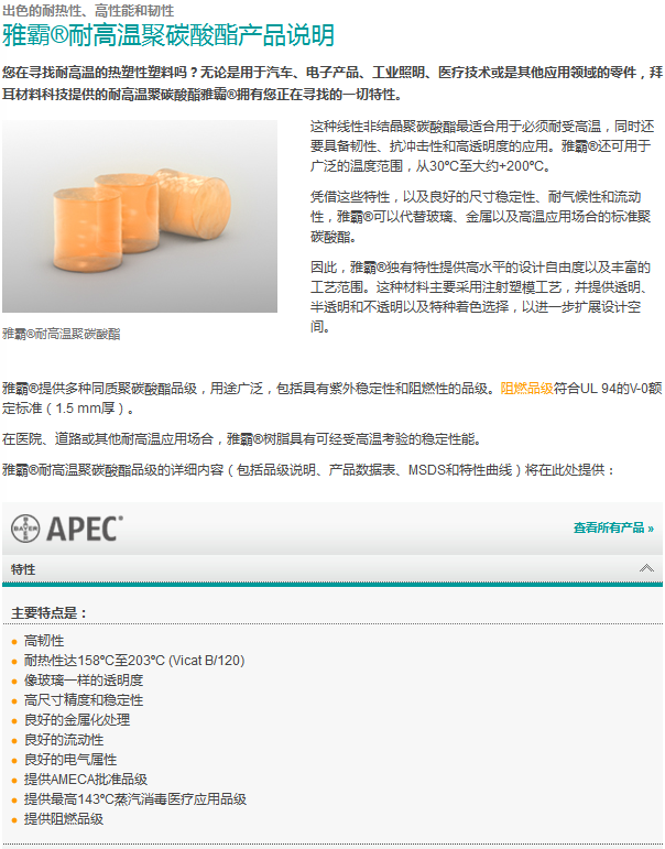 雅霸® 是共聚碳酸酯(PC-HT)的商品名,它是在模克隆®聚碳酸酯的基礎(chǔ)上進(jìn)一步開發(fā)而成的產(chǎn)品系列。憑借其高耐熱性、韌性、透明度、光穩(wěn)定性和流動(dòng)性性能的獨(dú)特組合,雅霸®不同于其它任何一種工程熱塑性塑料。特別值得一提的是其卓越的耐熱性能,其中某些品級(jí)別的產(chǎn)品甚至可以在高達(dá)220℃。因此,雅霸®是使其注塑件可在較高的熱應(yīng)力環(huán)境下使用模制品的理想材料,而在這些場(chǎng)合下通用型聚碳酸酯不再適用。