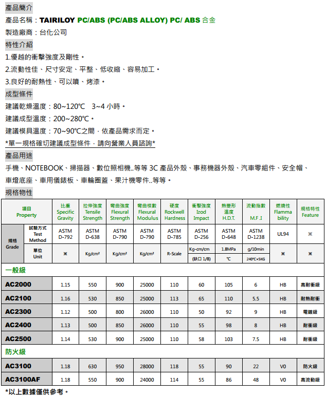 | PC/ABS | AC2000 | 超高耐衝擊性、高耐熱性、 一般成型 | 手機(jī)外殼、汽車(chē)零組件、安全帽、車(chē)燈底座、注射針筒外殼、電子類塑膠元件 |
