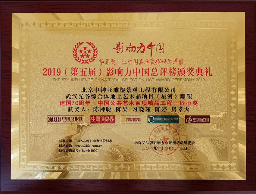 中神亞公司匠心打造的武漢光谷綜合體地上藝術(shù)品項(xiàng)目《星河》雕塑,榮膺建國(guó)70周年-中國(guó)公共藝術(shù)百項(xiàng)精品工程--匠心獎(jiǎng),同時(shí)中神亞創(chuàng)始人陳神聰董事長(zhǎng)榮膺新時(shí)代-最美奮斗者榮譽(yù)稱(chēng)號(hào)。